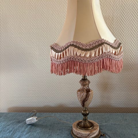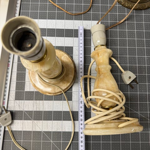 Der indgår både reservedele og funktionelle alabastlamper her. Som du kan se er en alabastlampe der er klar til brug. Denne monteret med topledning og fatning i låget.