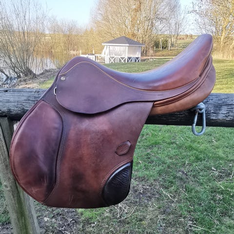 Dejlig Henri de Rivel springsadel med rigtig god knæ- og lægstøtte. Sort, 17,5 tommer, fit 3. Uldstopning. Alle syninger er intakte, gjordstropper er også fine. Ingen større ridser.