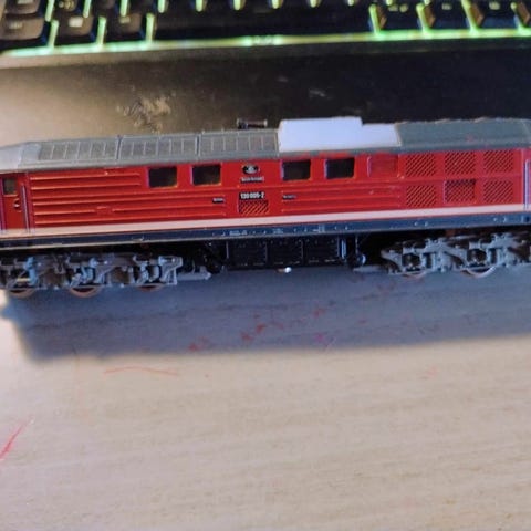 Står helt som nyt , men togføreren er faldet ned fra stolen, og ligger inde i førerhuset