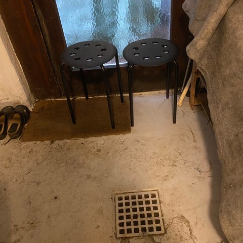 Taburetten er i rigtig god stand, dog med lidt brugsspor på fodstøtten og en næsten usynlig plet på betrækket.