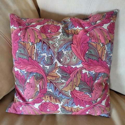 Runde og firkantede puder i Campari stof, Caspari, Forskellige størrelser puder med det samme motiv af flotte blomster i kraftigt kvalitets bomuld med lynlås. En stor rund pude, to mindre runde, to små rektangulære og en kvadratisk.