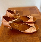 Lækre bløde latin dansesko med 4 cm hæl, skind sål og ferskenfarvet satin. Justerbar spænder. Nypris 860kr. Sælges for halv pris