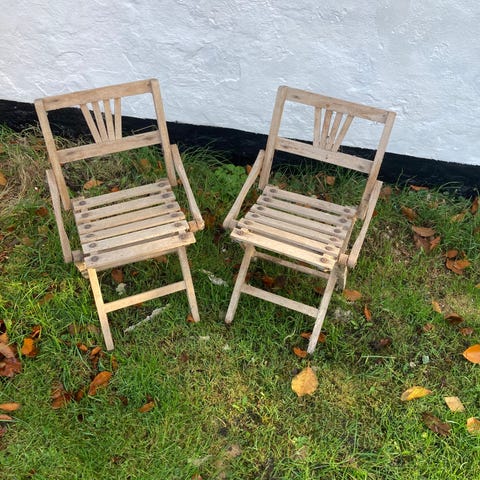 Sælger 2 stk liggestole. Den ene er flækket ved skammelens beslag, kan laves, men kan også bruges som den er, eller uden skammel.