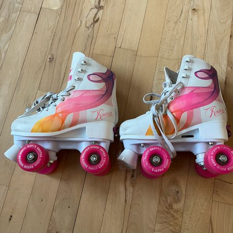 Klassiske side-by-side rulleskøjter fra Roces i str. EU 38 / UK 4. Hvid model med snørebånd og solid opbygning. Brugt men i god stand med få kosmetiske mærker, hjulene ruller let og stopperen foran er intakt. Perfekte til begyndere eller til nostalgisk rulleskøjteløb.