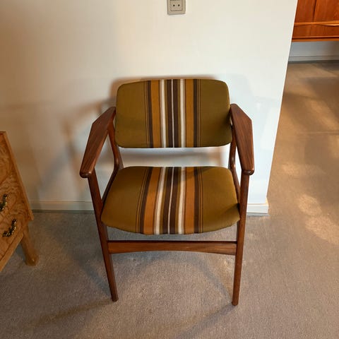 Arne Vodders Lene spisestuestol i teak og ny polstring i grå uld, fremstår som en tidløs klassiker.