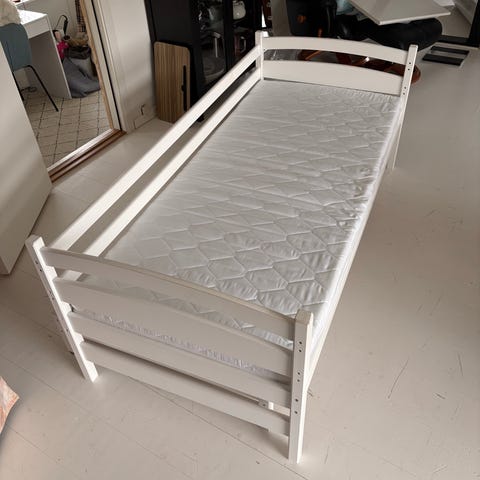 Børneudtræksseng i god stand. Sammentrukket er sengen 128 cm lang, maksimalt udtrukket måler den 215 cm. Liggebredden er på 80 cm. Madras medfølger.