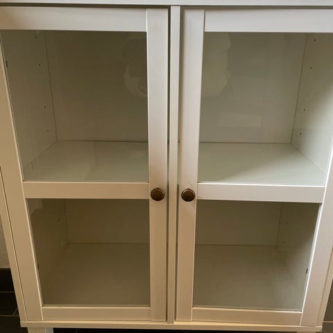 Lækkert glasskab med hylder fra Jysk. Fejler ingenting. Jeg har 2 stk. Pris er pr. stk. Bredde: 30 cm Højde: 50 cm Dybde: 18 cm Højde i mellem hver hylde: 16 cm