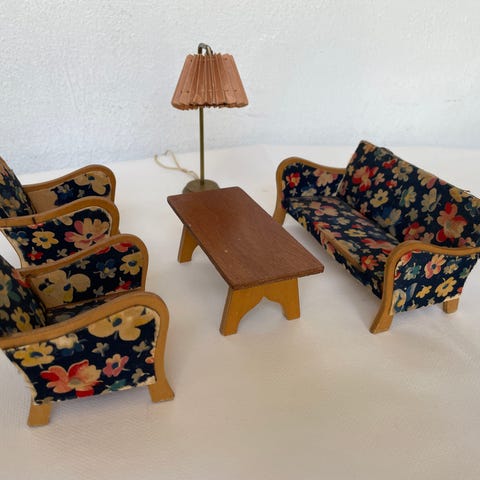 Tæppet måler 25x21cm, den antikke lampe er 21 cm. høj og sofabordet måler 9,5x 9,5 cm og højden er 6,5 cm. Sælges samlet.