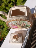 Drawing of a picnic in the forest. A lady plays the lute while her companions drink tea and listen. This is a classic English tea pot that has been used many times. There is charm in the gradual erosion made by human habits. I have washed the inside with backing soda and vinegar. It is now ready for use, again.