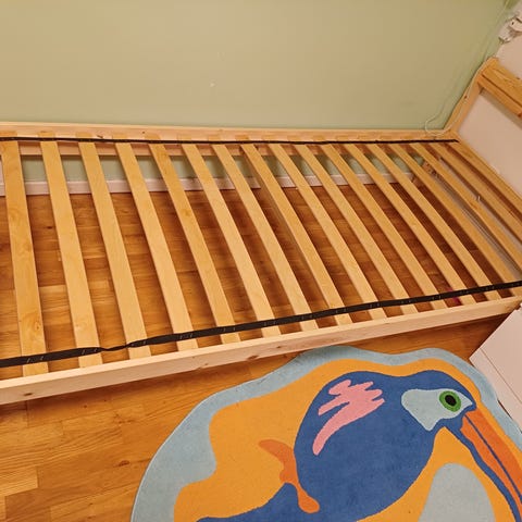 To år gammel seng med to udtræksskuffer sælges med madras. Sengens mål er 90 x 200.