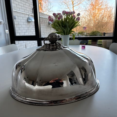 Lågfad, Pletsølv, 70 år gl., Smukt lågfad, fin til jule anden, og skrue toppen af, og så bruge det Champagne køler til Nytår.