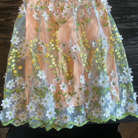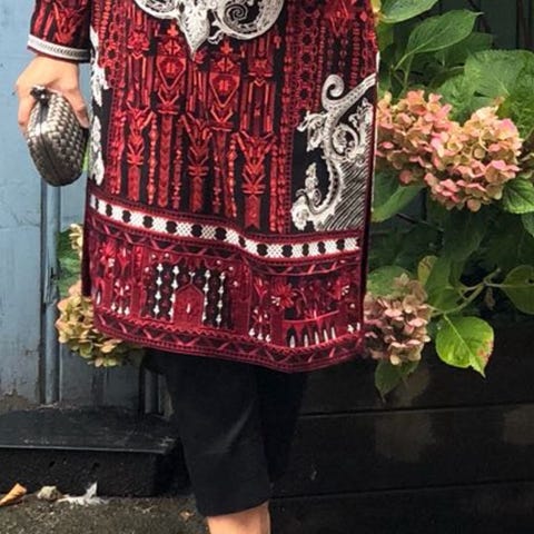 Customized af mig til dig med unikt udtryk, hvor der er anvendt vintage håndarbejde - hæklede stykker på ryggen og ved kanten af nederdelen. Bredt ternet bånd fra 80’er-skjorte foran på nederdelen. Lille stykke blonde over den ene lomme på jakken.