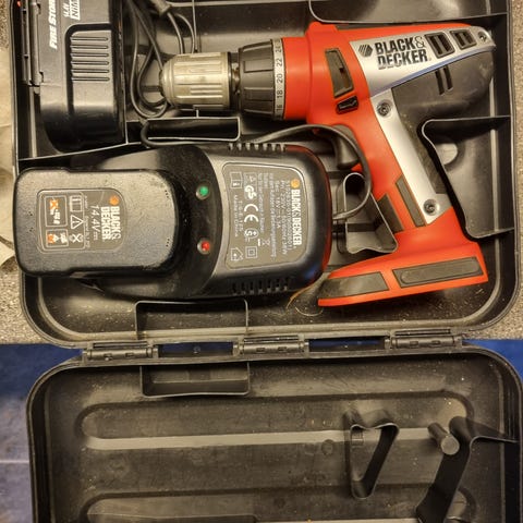 Med oplader og 3 batterier, i kuffert