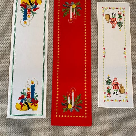 Mønster til juleløber. Svigermor har broderet løberen, nu vil hun gerne sælge mønsteret hvis der er andre der kunne tænke sig at brodere den fine juleløber. Færdig mål er ca. 24,5 x 65 cm den kan sendes.