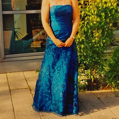Smuk blå stropløs gallakjole med lille slæb. Kan evt tages af og bruges til at sy stropper, hvis ønskes.