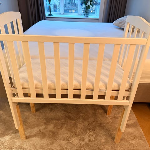 Super flot bedside crib fra basson. Kun brugt få måneder af et barn fra 2023, er derfor som ny. Kan justeres i begge ender. Medfølger praktisk pose til opbevaring. Nypris var 1500kr.