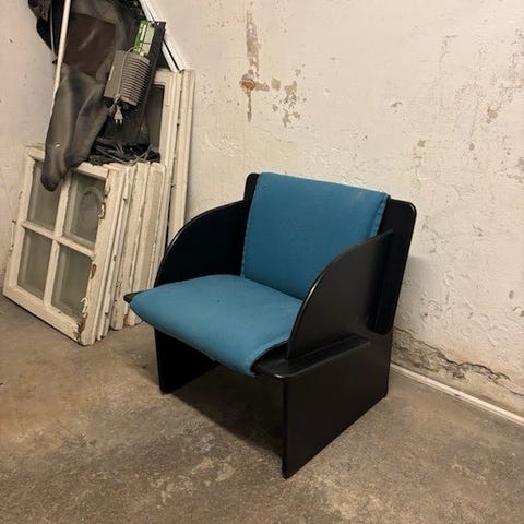 Er fuldstændig nyrenoveret både træ, og nypolstret med blå meleret Kvadrat design stof.