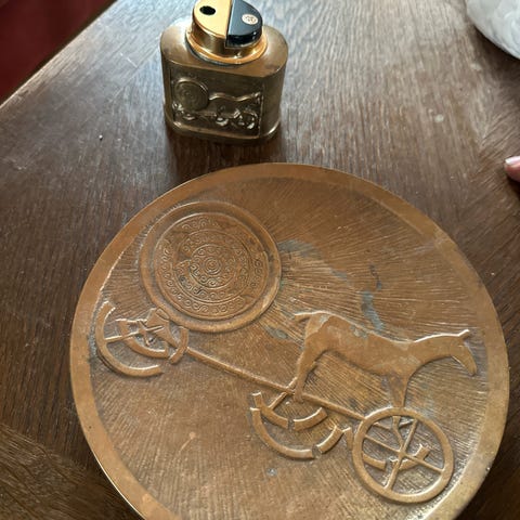 Fin lille solvogn i messing.Askebæger måske.Det måler 14 cm lang og 9 cm bred