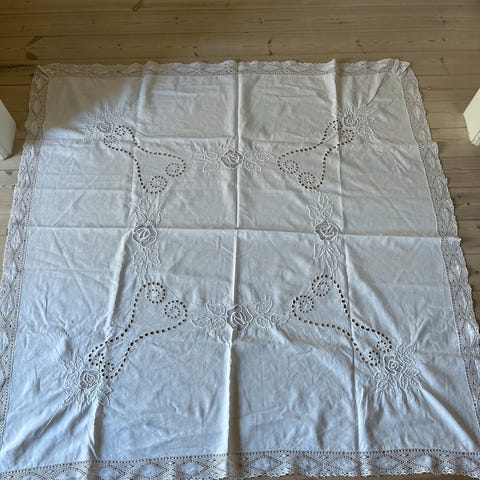 Turkisfarvet aflang dug med frynser, brugt men stadig i fin stand, måler 120 cm i bredden og 235 cm i længden, enkel mindre plet nederst i den ene ende, ikke forsøgt fjernet.