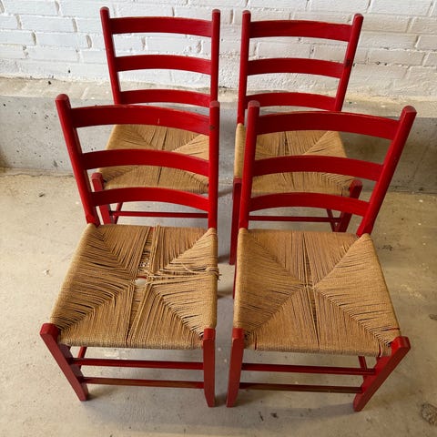 Der er enkelte mørkere områder på flettet, og den ene stol har en mindre revne, der er limet ganske fint - se billede.