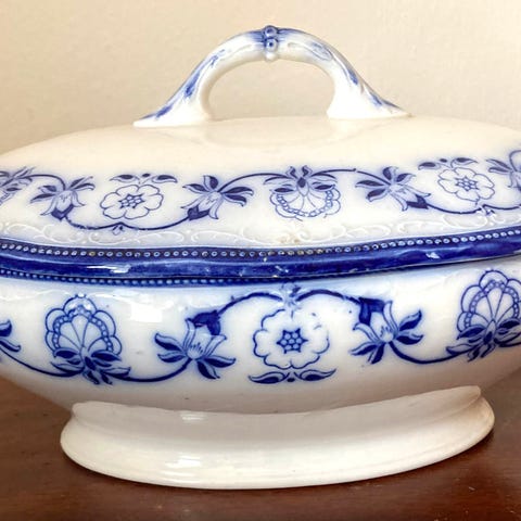 Fint og intakt stel uden skår. 4 flade og 5 dybe tallerkener, stor terrin, sovseskål og aflangt fad. Har derudover i tysk stel et par runde fade jeg har brugt sammen med stellet.