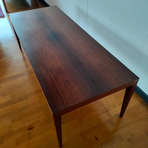 Meget smukt sofabord i palisander i smuk vintage stand, ingen finér skader, små ubetydelige ridser, man kan slibe og give det olie. Skal afhentes i Kagerup i Helsinge. Kan ikke leveres.