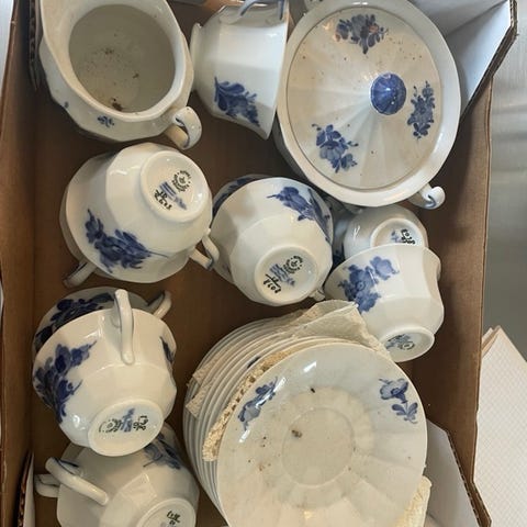 Kaffestel blå blomst royal Copenhagen samt skål og stort fad