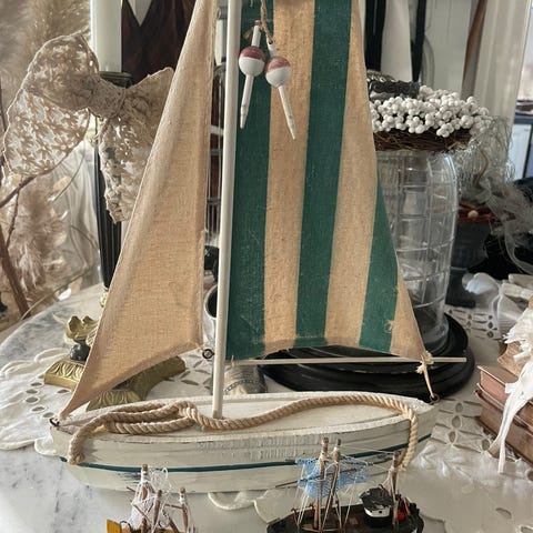 Gennemført træskib med mange små finesser. Længde max 25 cm højde max 20 cm. Så fint til sommerhuset.