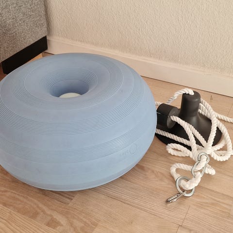 Mellem lyserød bobles donut samt gynge dele i kasse med pumpe til. Den har været brugt og begge dele har brugsspor.