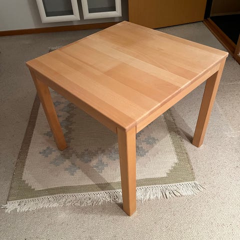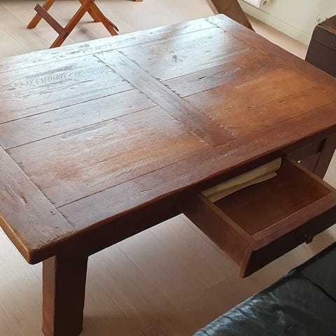 1 stk brugt Provence sofabord / Hjørnebord i sæbebehandlet massiv eg, der er slid på bordplade ( se billeder ) B og D:78cm. H:50cm. Sofabord er ikke nyt og sælges derfor som brugt, derfor kan der forekomme ridser, slid og skrammer. Prisen er kun 400kr.