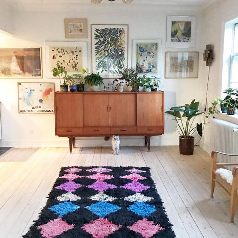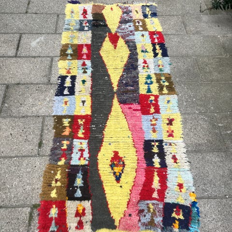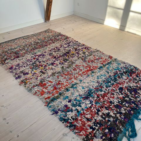 Helt fantastisk boucherouite tæppe fra Marokko. I smukt symmetrisk mønster. Mål: 133 cm L: 295 cm. Skal hentes i Vanløse. Pris 2.500,-