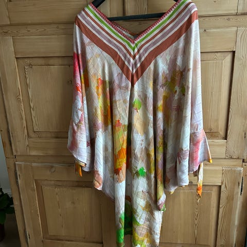 Smuk håndsyet kaftan kjole i onesize i blød lækker håndprintet bomuld.
