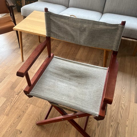 Foldbar instruktørstol i træ med hvidt stofsæde og ryglæn. Stolen er praktisk til både indendørs og udendørs brug og kan nemt foldes sammen for opbevaring eller transport. Den er velegnet til brug i hjemmet, på terrassen eller til camping.