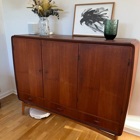 Utroligt flot Teaktræ skænk fra starten af 60 erne. Meget velholdt og bemærk de flotte håndtag på Lågerne og skufferne