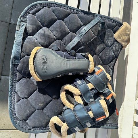 Rødt underlag med anky gamacher. Pris 200 kr.