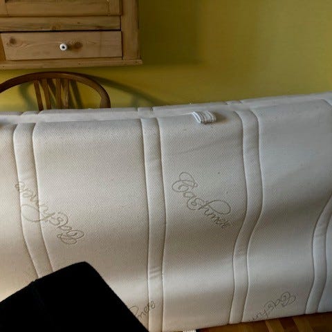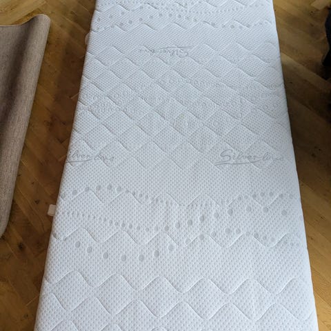 1 lysegrå vendbar springmadras fra MasterBed, købt i Drømmeland.