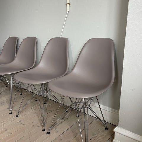 4 stk eames stole i hvid skal med ahorn ben samt sort hynde. Pr stk 1500. Kvittering haves