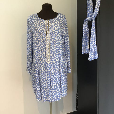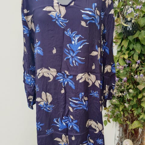 Luftig , multifarvet kjole i 100% viskose . Har 3/4 ærmer , lommer og god vidde . Længde fra skulder 95 cm . Bådformet halsudskæring . Sender gerne på købers regning eller afhentning i Faaborg 😊