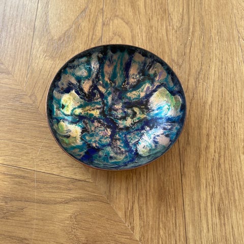 Er i keramik og ca. 24 cm i diameter.
