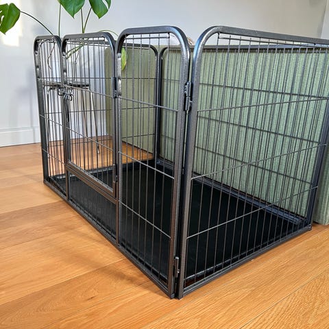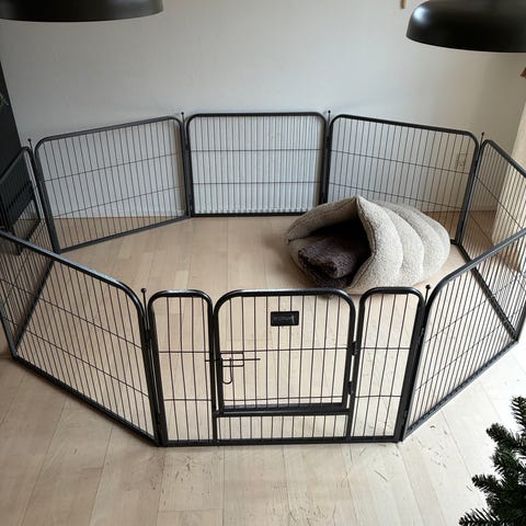 Kravlegård brugt til min hund i 1 måned, fremstår derfor stort set som ny. Kun hvor lågen åbnes og lukkes ses slid af malingen, men ikke noget der har betydning.