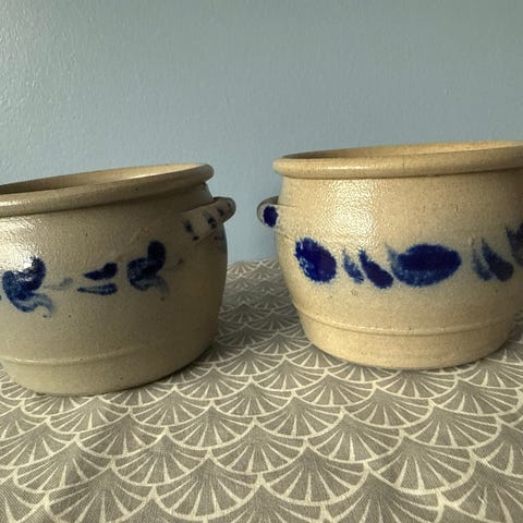 Stentøj, Krukker, 2 ældre grå stentøjskrukker med blå tegning.