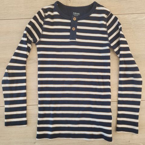 Stribet bluse i hvid og beige, i "bedstefar"-stil med knapper i halsen. Stort set ikke brugt. Fra røg og dyrefrit hjem. Se mine øvrige annoncer og vi finder en god pris. Sælger drengetøj str 56-134 og pigetøj str 56-176, som løbende bliver oprettet. Spørg gerne hvis du søger noget specifikt.