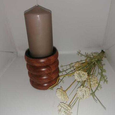 En fin og høj lysestage til bloklys i lyst træ.