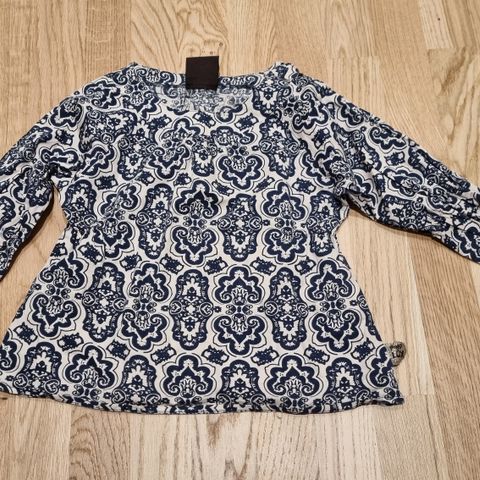 Farverne er grå, hvid og der er guldtråde i båndet foran. Str. 5-6 år, god plads i den.