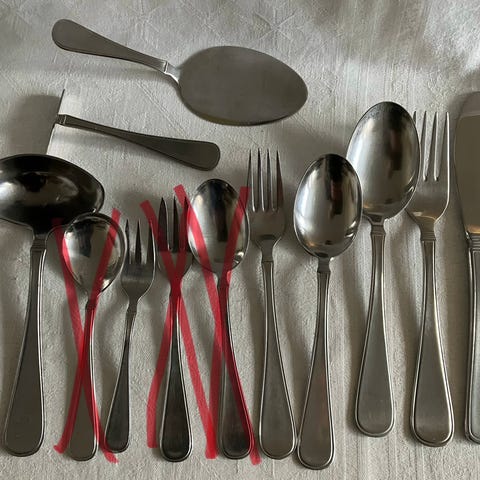 Bestikdele fra serien Pil 11 designet af Aage Helbig Hansen og fremstillet hos Dana. Fremstår med almindeligt brugsslid.