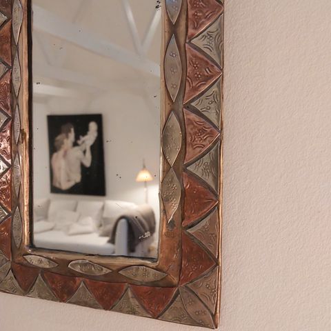 Dette udsmykkede "Feuille" (blad) spejl er en ægte fransk skat, der fremviser upåklageligt håndværk. Det distinkte vekslende kronbladsdesign skaber en sofistikeret rytme omkring rammen, hvor de varme patinerede kobberelementer harmonerer perfekt med sarte beige accenter - en farvepalet, der ubesværet komplementerer både moderne og traditionelle interiører.