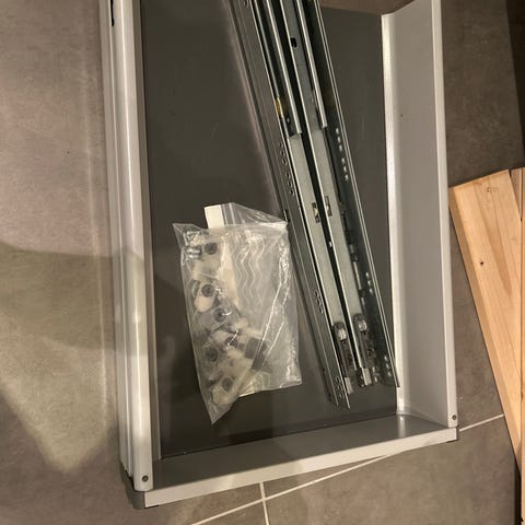 Skuffeskab, Skuffe HTH køkken, Træskuffe til HTH køkken - hvid med træfarvet kant, . Brugt til eksisterende ældre køkken. Listen i bunden af skuffen har været løs og limet nu,