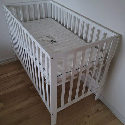 Der medfølger comfort madras, uro med lyd og bevægelse, sengekantbeskytter