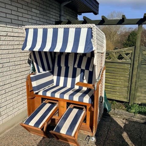 Vi sælger vores meget smukke strandstol. Den har altid stået inde og har regnslag som passer direkte til den. Den kan ses hos Mygind design. Her kan der læses om den. Virkelig god kvalitet, på hjul. Kan transporteres på en trailer. https://mygind.se/tgh2/dansk/highlights-dk