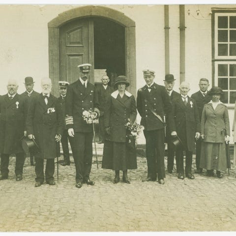 Ubrugt fotokort med den norske kronprinsfamilie, kronprins Olav (senere Olav d. 5.), kronprinsesse Märtha og prinsesse Ragnhild. Fra 1931. Kortet har et par trykmærker i kanten. Ellers fint kort.
